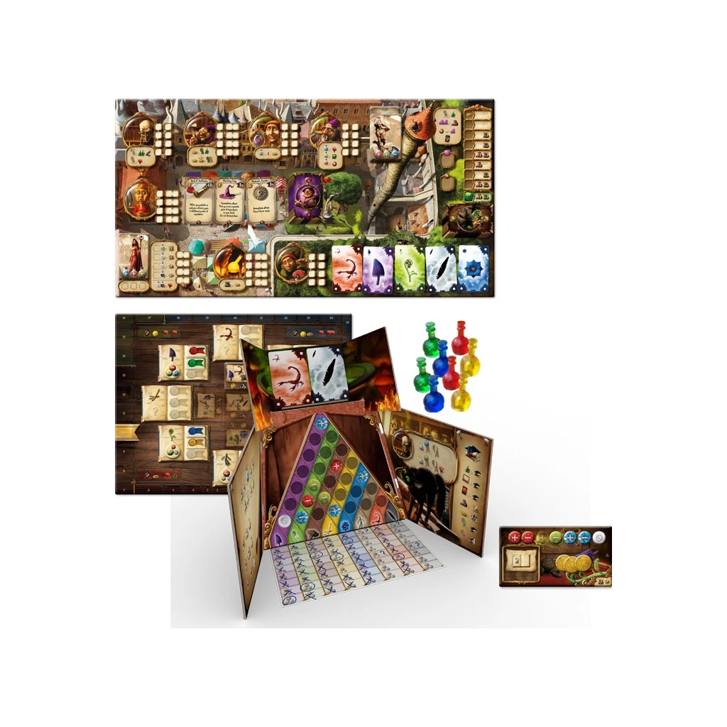 Contenu : 1 plateau de jeu réversible, 1 plateau des Théories, 1 plateau Grande Exposition, 4 paravents Laboratoire, 4 triangles des résultats, 4 plateaux joueurs, 6 tuiles Aventurier, 2 tuiles Conférence, 5 tuiles Subvention, 8 jetons Alchimie, 104 jetons Potion, 36 Pièces d’Or, 44 jetons Sceaux (11 par couleur), 6 jetons Conflit, 1 jeton Premier Joueur, 8 tuiles Ingrédient, 1 plateau Maître des Potions, 40 cartes Ingrédient, 22 cartes Faveur, 18 cartes Artefact, 16 cartes Réduction, 8 marqueurs Flasque (2 par couleur), 24 cubes Action (6 par couleur), 1 bloc de grilles de déduction, Récipients pour les jetons et 1 livret de règles