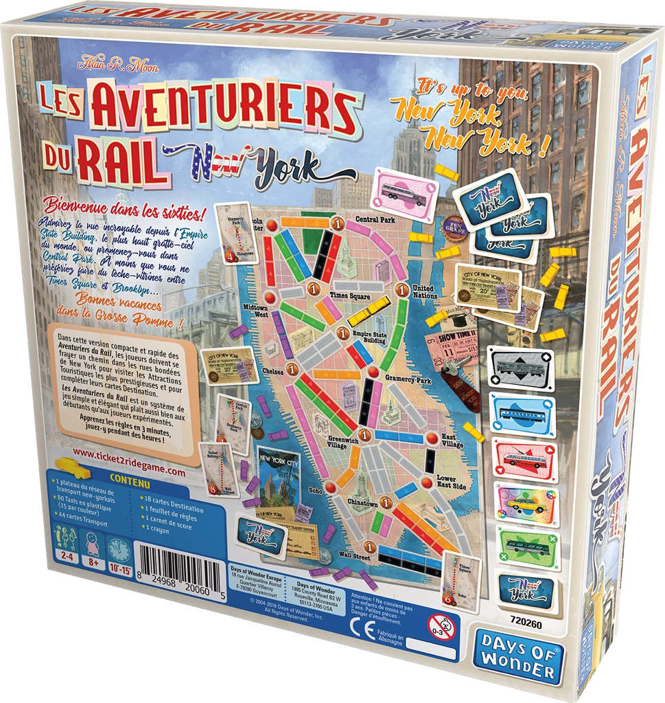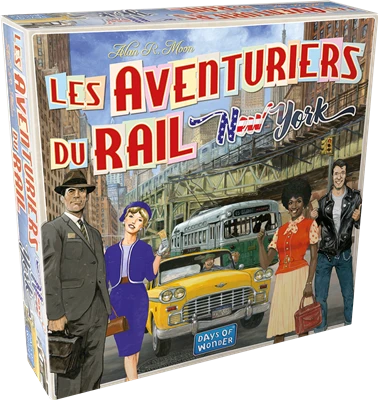 Les Aventuriers du Rail : New York est une variante plus courte des Aventuriers du Rail. Les joueurs doivent se frayer un chemin, cette fois-ci en taxi, aÌ travers New York, afin de visiter les attractions touristiques et complĂ©ter leur cartes Destination. Avec son rythme soutenu et son format rĂ©duit, les Aventuriers du Rail : New York promet de plaire aussi bien aux dĂ©butants, qui pourront apprendre aÌ jouer en 3 minutes, quâaux joueurs expĂ©rimentĂ©s.