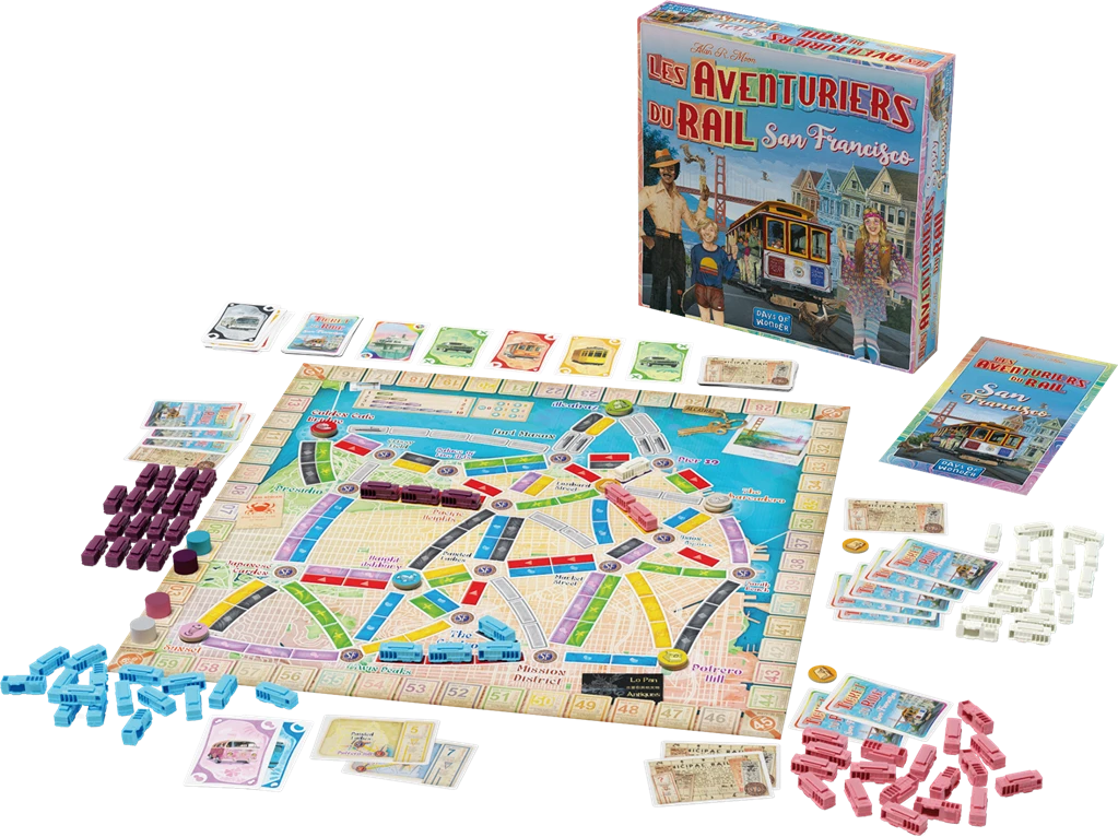 1 plateau du réseau de transport de Los Angeles, 80 figurines de funiculaires, 21 jetons touriste, 44 cartes Transport, 24 cartes Destination, 4 marqueurs de score, 1 feuillet de rÚgles.