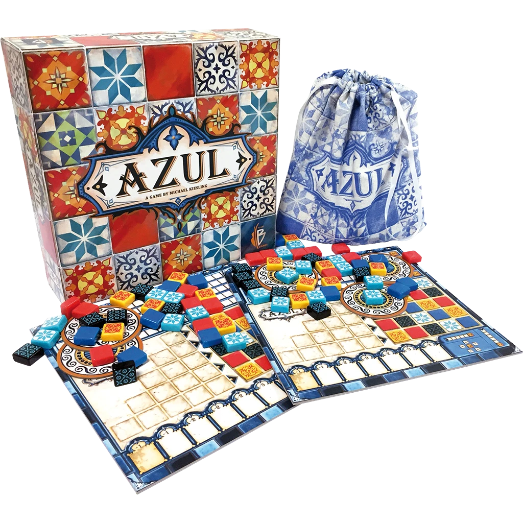 Azul vous place dans le rôle d’un chef décorateur chargé de poser des Azulejos dans le palais du roi Manuel 1er, au XVIe siècle. Chaque joueur dispose d’un plateau composé d’une piste de score, de lignes de motifs et d’un mur de palais. À chaque manche, des tuiles (il y a 5 motifs différents) sont piochées dans un sac et disposées sur des ‘fabriques’. À son tour de jeu un joueur va pouvoir prendre toutes les tuiles d’un même motif sur une fabrique et les déposer sur ses lignes de motifs. Quand une ligne est complétée par des tuiles identiques, il peut en poser une sur son mur de palais. En alignant ainsi des tuiles sur le mur du roi, on marque des points. Azul est un jeu de pose de tuiles très malin, qui sort des poncifs habituels du jeu abstrait pour offrir un jeu séduisant et dépaysant.