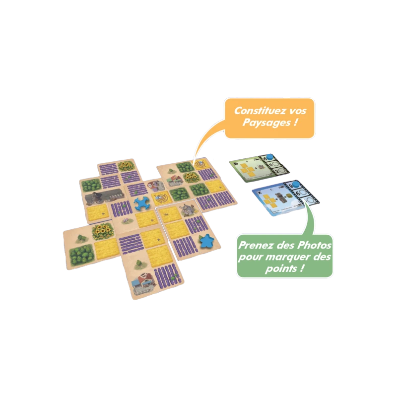 Placez les cartes de scÚne puis déplacez le photographe et le drone afin de prendre différentes photos dans le jeu. Les photos et les différentes scÚnes rapportent des points. Le joueur qui a le plus de points à la fin du jeu gagne.