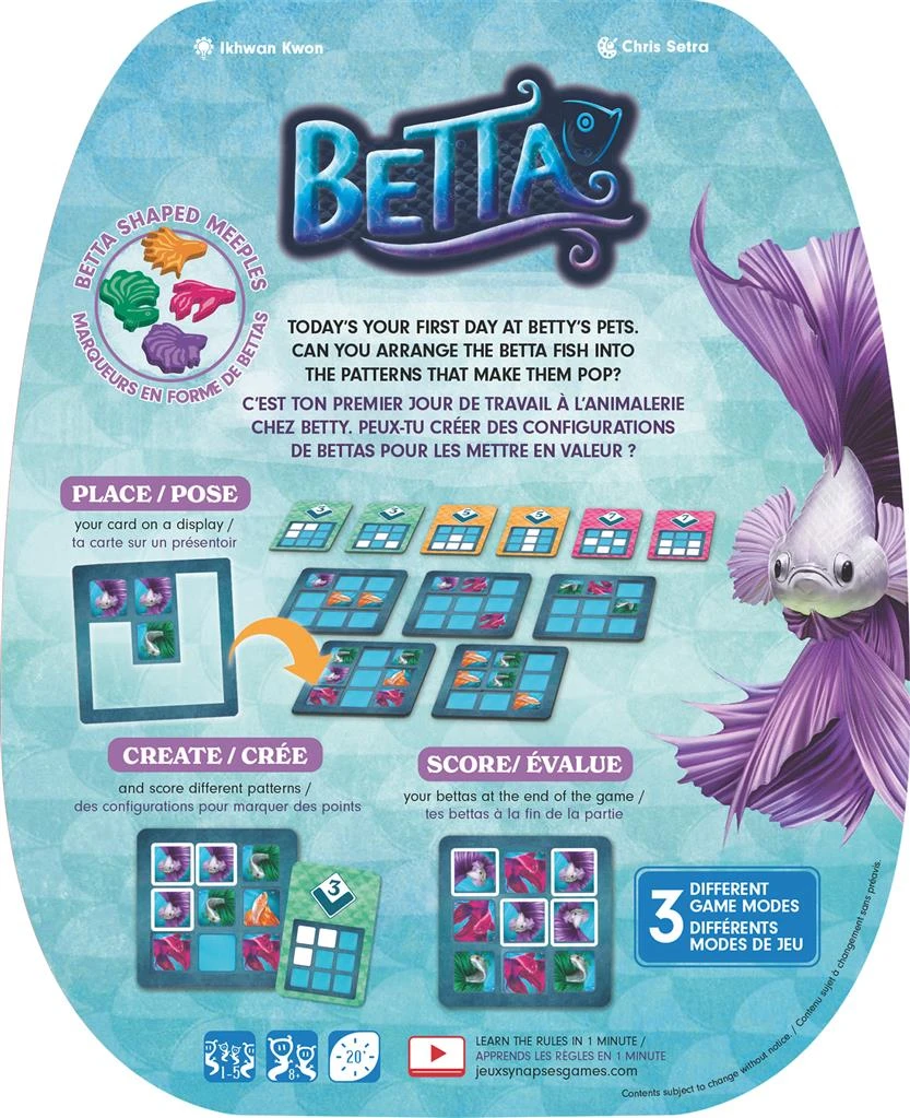 Dans Betta, une espèce de poisson combattant est attribuée à chaque joueur. Il suffit de créer des arrangements de poisson en créant différentes configurations pour lesquelles des points sont donnés en fonction de leur complexité. De plus, lorsque la partie est terminée, tous les joueurs marquent des points selon le nombre de betta visible, de leur couleur, sur chacun des présentoirs. Betta comprend 3 modes de jeu, soit classique, asymétrique et solo, dans lesquels différentes stratégies sont à appliquer.