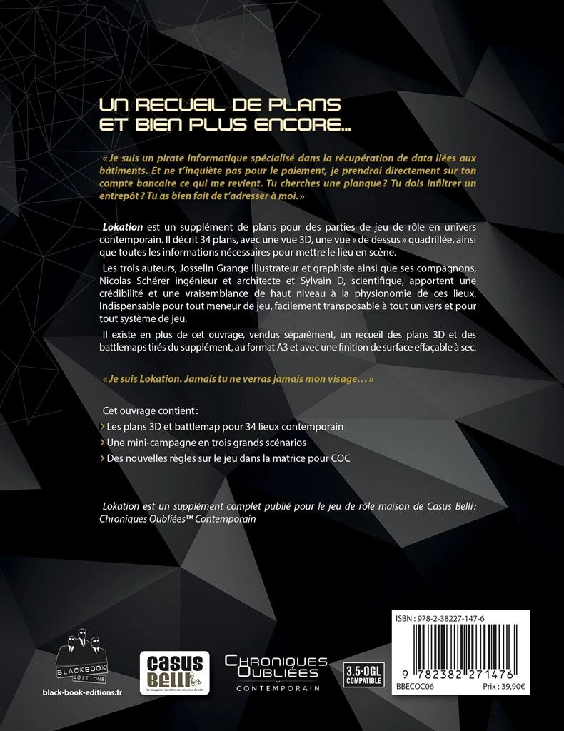 Les trois auteurs, Josselin Grange illustrateur et graphiste ainsi que ses compagnons, Nicolas Schérer ingénieur et architecte et Sylvain D, scientifique, apportent une crédibilité et une vraisemblance de haut niveau à la physionomie de ces lieux. Indispensable pour tout meneur de jeu, ces 224 pages sont facilement transposables à tout univers et pour tout système de jeu.