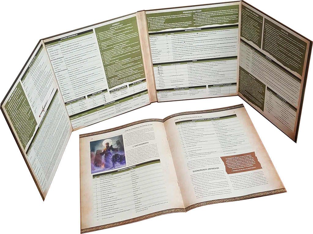 Cet ouvrage inclut toute une série de règles de référence faciles à consulter pendant le jeu, ainsi qu’un écran du maître de jeu à quatre panneaux (format portrait) contenant tous les tableaux essentiels du livre de base de Conan. Vous aurez donc tous les outils nécessaires pour donner vie au monde d’Howard.