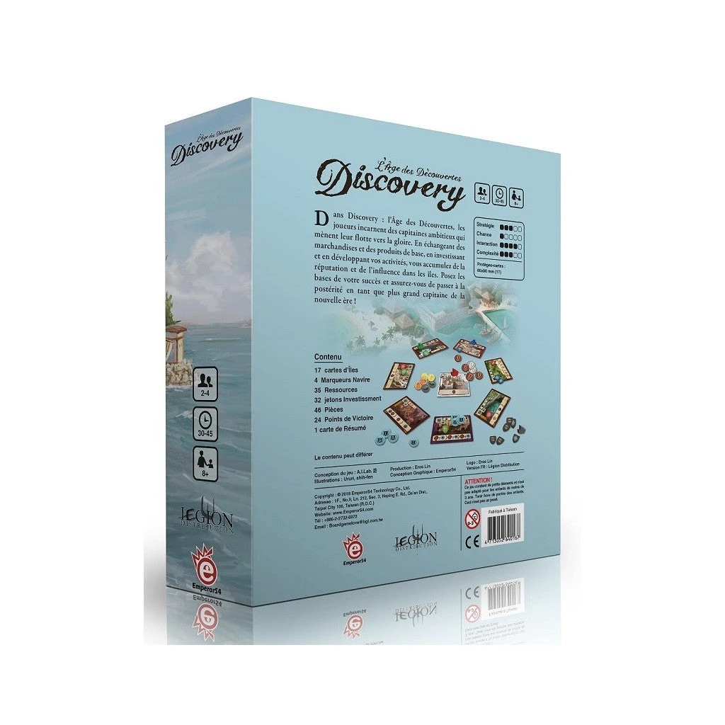 Avec les progrès de la construction navale et de la navigation, d’innombrables explorateurs courageux s’aventurent sur les mers, à la découverte de terres et d’îles inconnues. Les flottes de plusieurs pays sillonnent les océans. L’ouverture de nouvelles routes maritimes accélère les échanges culturels et commerciaux et annonce l’avènement d’une ère nouvelle. Dans Discovery : L’Âge des Découvertes, les joueurs incarnent des capitaines ambitieux qui mènent leur flotte vers la gloire. En échangeant des marchandises et des produits de base, en investissant et en développant vos activités, vous accumulerez de la réputation et de l’influence dans les îles.