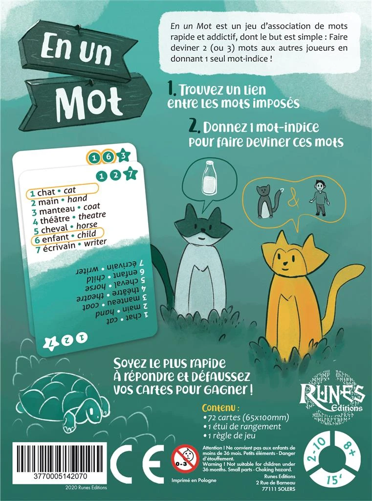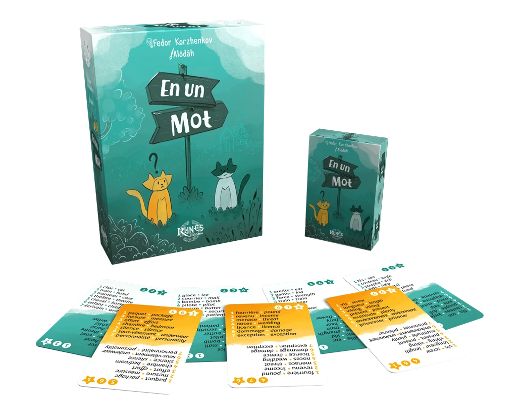« En un Mot » est un jeu d’association de mots rapide et addictif. Sur chacune des cartes que les joueurs ont en main, une liste de 7 mots. Tour à tour, on pose une de ses cartes au centre de la table et l’on doit faire deviner 2 ou 3 (en mode difficile) des mots, en ne prononçant qu’un seul autre mot ! Si un des joueurs identifie les mots concernés, il se débarrasse d’une de ses cartes. Le premier à ne plus en avoir l’emporte !