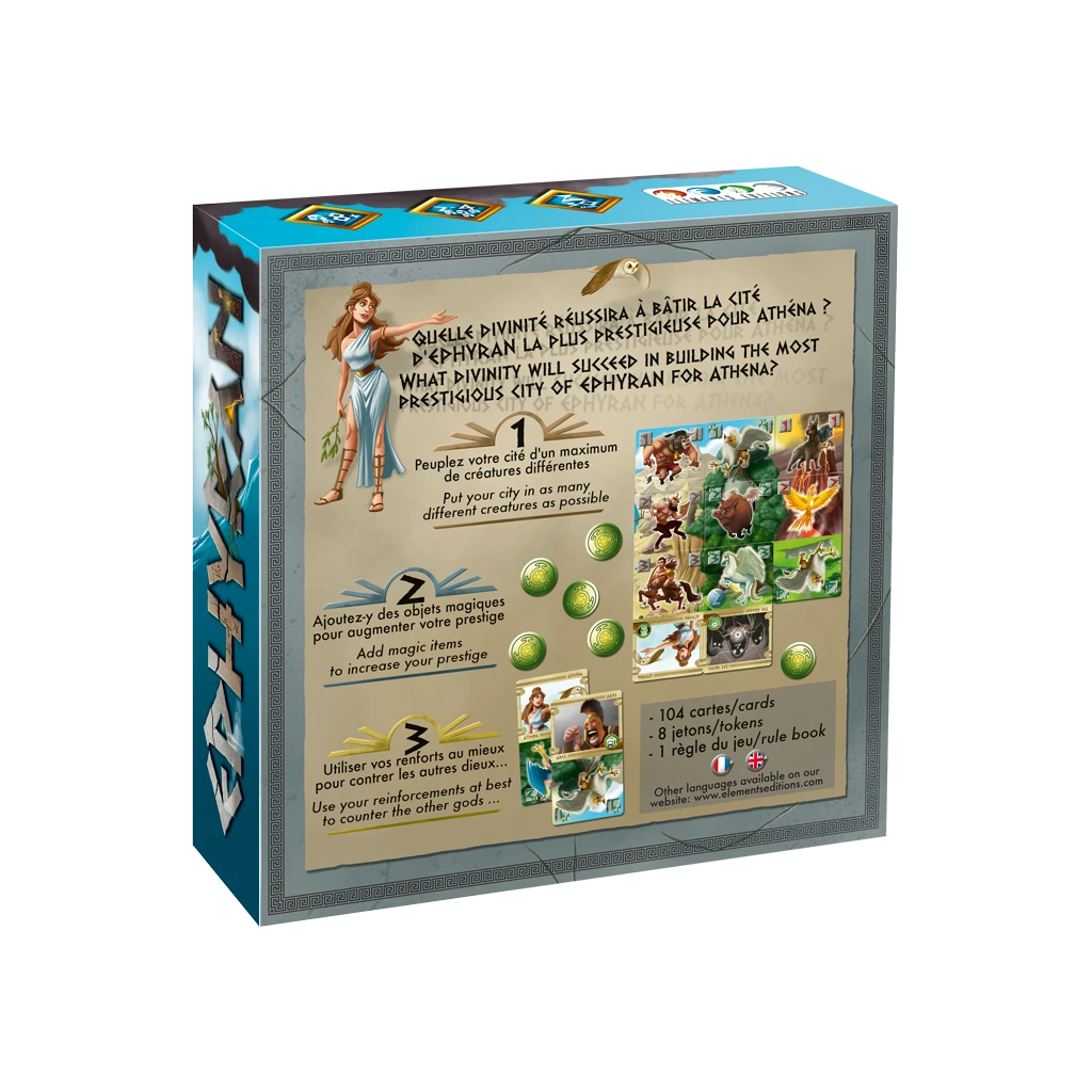 Quelle divinitĂ© rĂ©ussira Ă bĂątir la citĂ© dâEphyran la plus prestigieuse pour AthĂ©na ? Choisissez votre divinitĂ© : Poséïdon, Gaia, Eole ou HĂ©phaĂŻstos⊠Commencez Ă bĂątir votre citĂ© et peuplez-la dâun maximum de crĂ©atures diffĂ©rentes ! Ajoutez-y des objets magiques pour augmenter votre prestige et utiliser au mieux vos renforts pour contrer les autres dieux⊠le systĂšme original de cartes Ă 2 cĂŽtĂ©s, le thĂšme immersif et les illustrations magnifiques du jeu, vont feront plonger dans lâunivers de la mythologie grecque oĂč stratĂ©gies et coups bas vous permettront dâobtenir les faveurs dâAthĂ©na ! Serez-vous Ă la hauteur ?