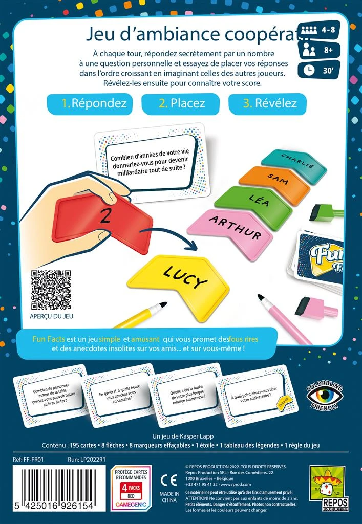 Fun Facts est le nouveau jeu d’ambiance coopératif de Repos Production ! Après Just One et So Clover, voici un nouveau party game rapide et bienveillant, idéal pour l’apéro ! Vous allez vous découvrir les uns les autres, en répondant à des questions qui partent dans tous les sens.