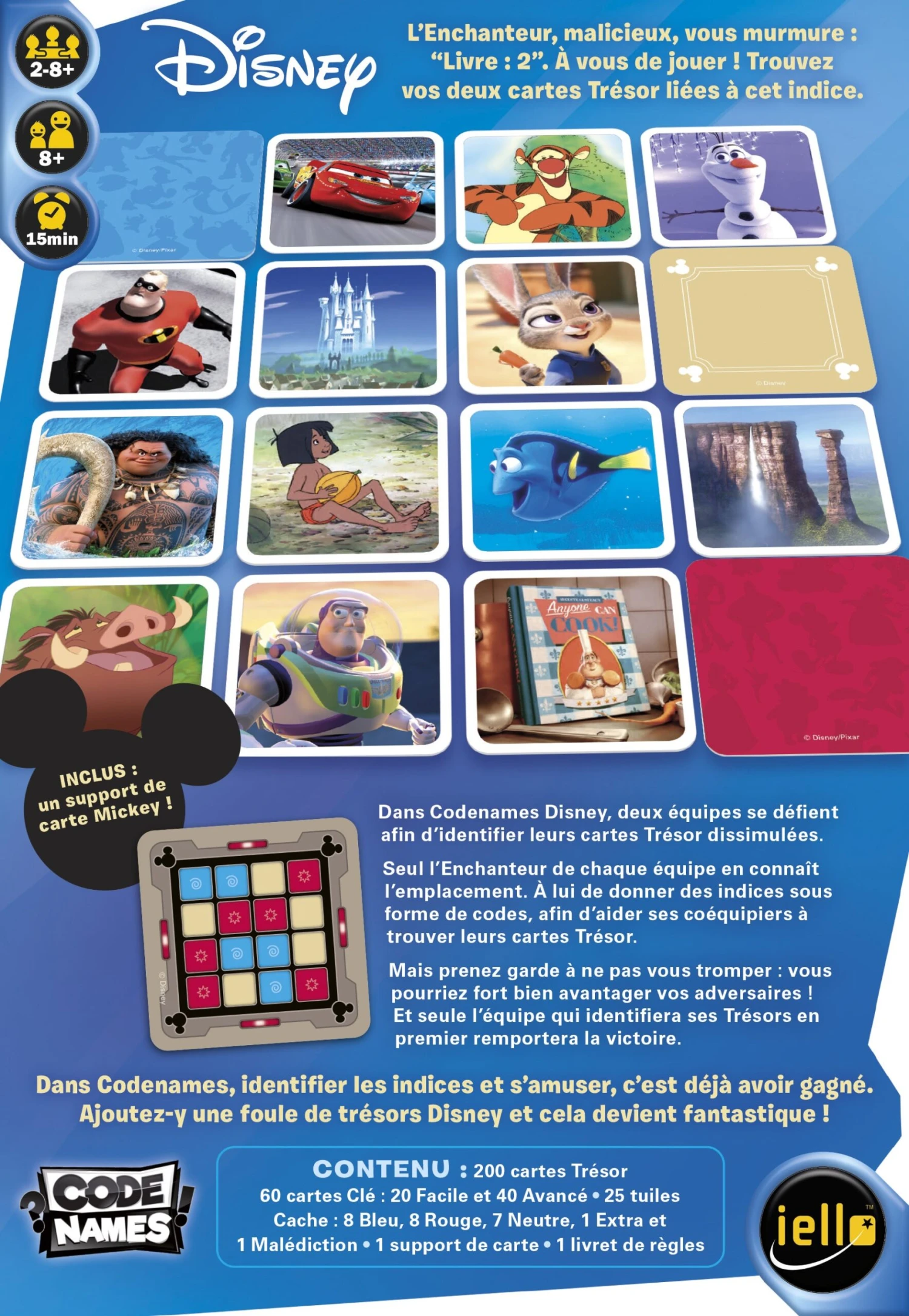 Dans Codenames Disney, deux équipes se défient afin d’identifier leurs cartes Trésor dissimulées.