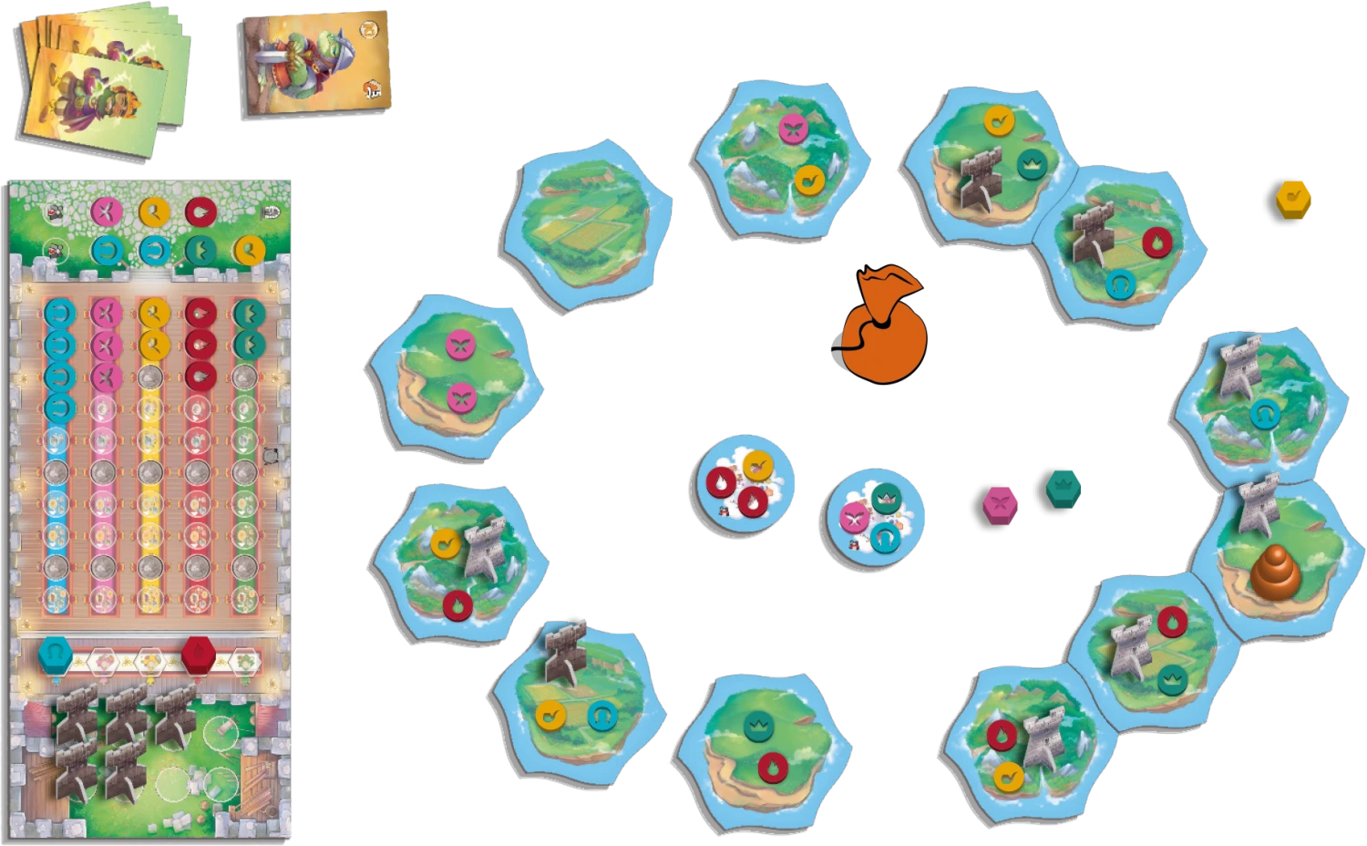 • Contenu : 12 tuiles Île, 4 plateaux Ecole, 22 tours, 1 pion Mère Nature, 130 disques Étudiant, 1 sac, 4 tuiles Nuage, 5 pions Professeur, 40 cartes Assistant, 12 cartes Personnage, 20 pièces, 4 tuiles Entrée interdite et 1 livret de règles.