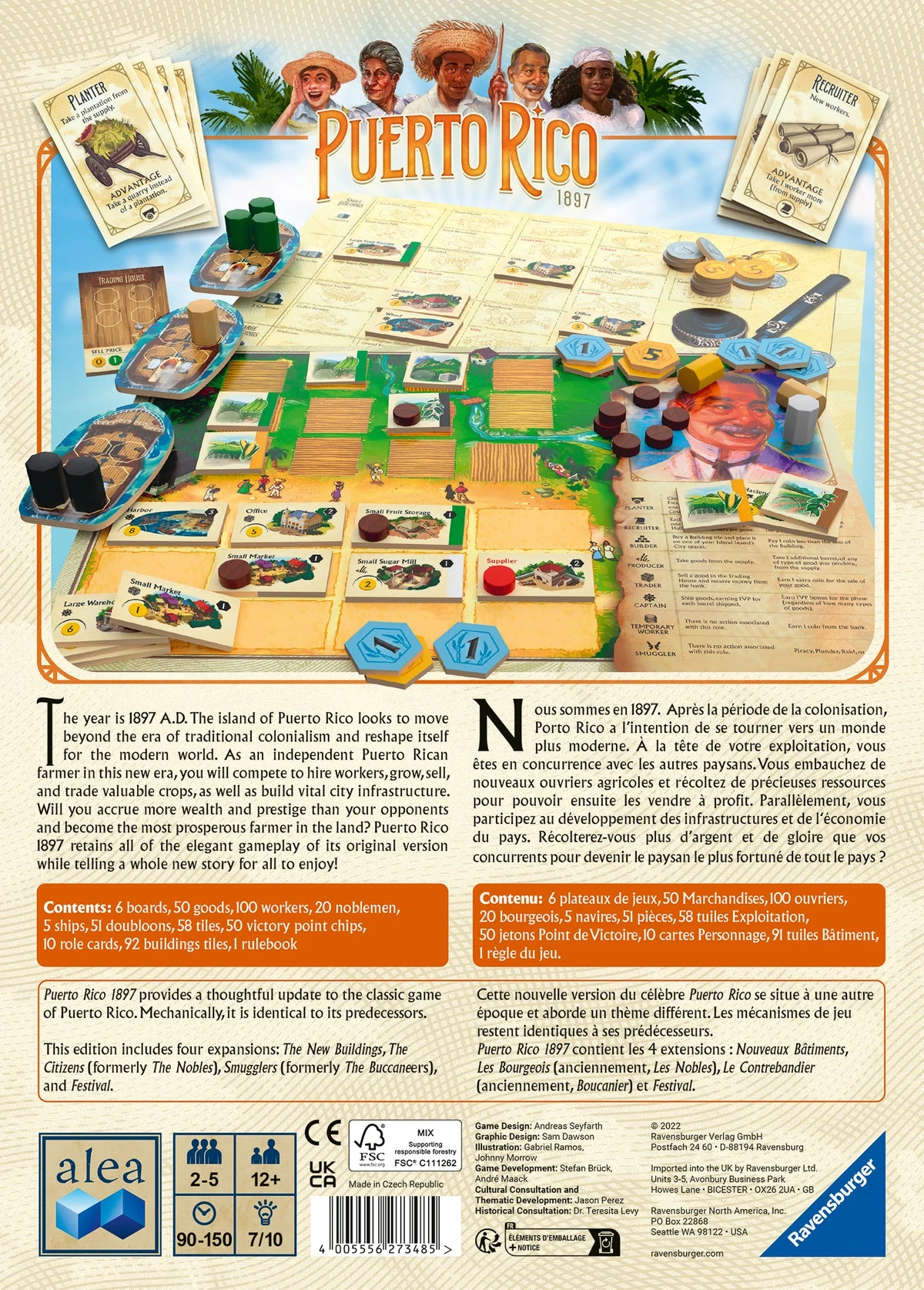 âąÂ Contenu : 5 plateaux Domaine, 1 plateau de jeu, 1 Carte Gouverneur, 8 Cartes Personnage, 49 BĂątiments, 58 Tuiles Terrain, 1 Registre Personnel, 5 Navires de Transport, 1 Maison de Commerce, 100 Ouvriers, 50 Marchandises, 50 jetons Point de Victoire, 51 Jetons Pesos et 1 livret de rĂšgles.