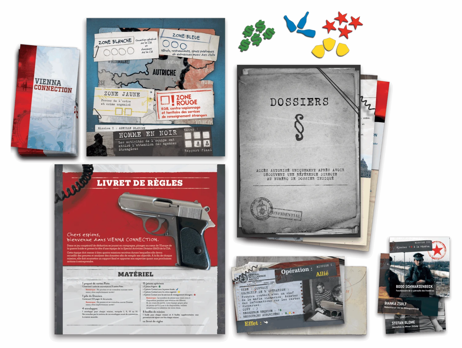 Enrichissant la mécanique de Detective – Un jeud’enquête moderne, Vienna Connection est le point de départ de soirées jeuxparticulièrement immersives qui plongent les joueurs dans un contextehistorique fouillé et palpitant à jouer. Interrogatoires, écoutestéléphoniques, messages codés : avec un matériel plus riche et unedocumentation qui restitue l’atmosphère de l’époque, Vienna Connection offre aujoueur une expérience de jeu unique, moins connectée, et lui permet de vivre lahaute tension de l’univers des agents infiltrés.