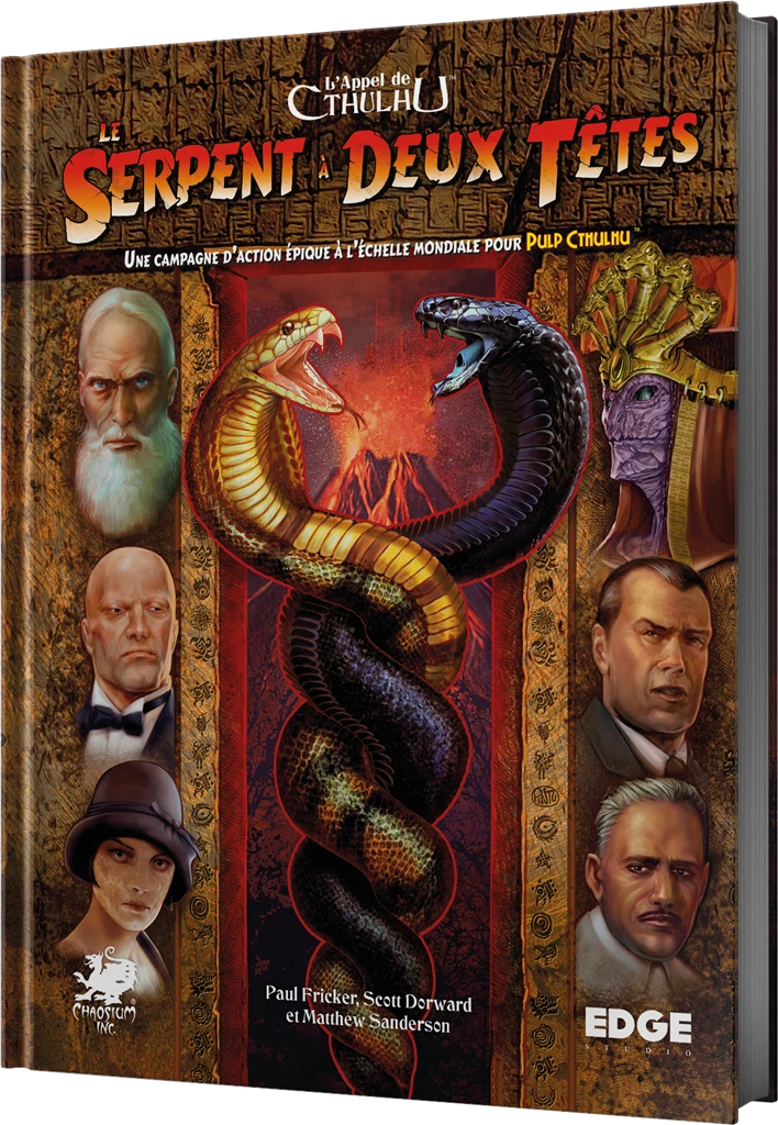 Le Serpent à Deux Têtes est une campagne épique et explosive, débordant de péripéties et se déroulant dans le Cthulhu Pulp des années 30. Les investigateurs se confrontent aux manigances sinistres d’une ancienne race de monstres décidée à régner sur un monde qui était autrefois le leur. Les héros, en travaillant pour Caducée, une ONG médicale, fouilleront un temple perdu dans les forêts de Bolivie, tiendront tête à la Mafia de New York, risqueront leur vie durant une épidémie mortelle dans les jungles de Bornéo, et exposeront au grand jour les plans d’un culte étrange dans le dust-bowl de l’Oklahoma. Ils devront aussi infiltrer le territoire de leurs ennemis au cœur d’un volcan grondant en Islande, être témoins d’abominables expérimentations médicales au Congo, jouer contre la montre pour s’emparer d’un objet magique ancien et puissant dans les rues de Calcutta, et, enfin, voyager jusqu’à un continent perdu pour y mener une bataille désespérée : sauver l’humanité de l’esclavage et de l’annihilation !