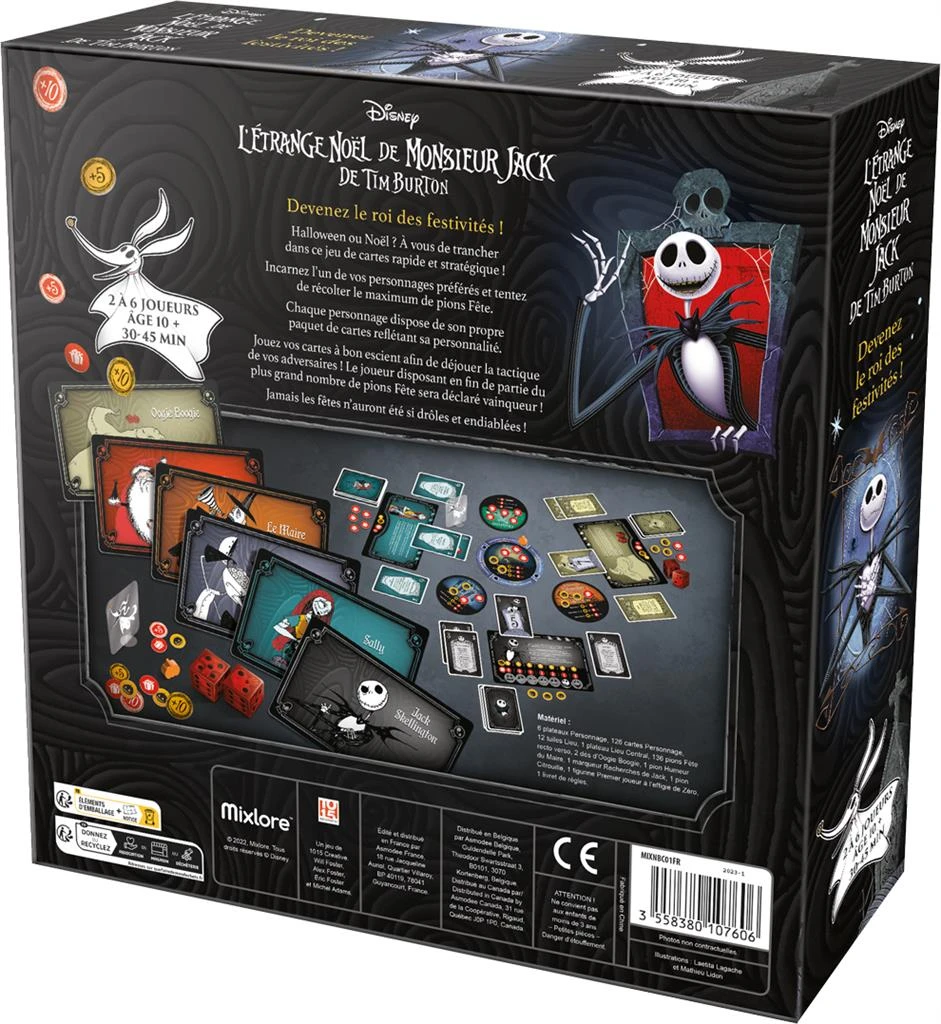Choisissez l’un des 6 personnages emblématique de l’univers de Tim Burton et jouez au mieux les cartes de votre deck pour gagner le plus de jetons Vacances possible sur les différents lieux. Une grande rejouabilité avec des decks de cartes aux pouvoirs variés. Ferez-vous gagner la fête de Noël ou celle d’Halloween ?
