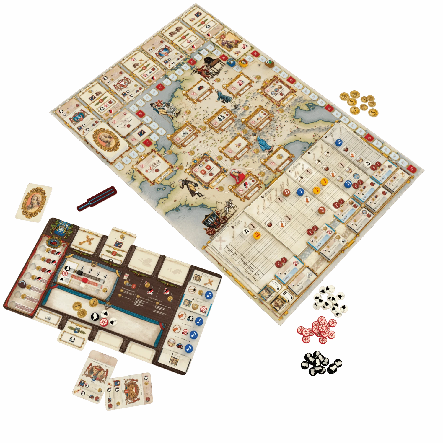 Pendant la partie, vous jouez des cartes d’une main limitée que vous améliorez au fur et à mesure de la partie. Ces cartes (Différentes pour chaque manche) peuvent être jouées soit comme des actions, soit comme des générateurs de ressources : à vous d’optimiser ressources et finances afin de soutenir votre version de l’histoire et votre relation avec la veuve de Mozart.