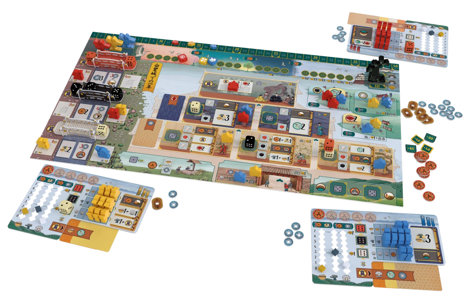 Le plateau de jeu représente le château de Himeji dans toute sa splendeur, divisé en plusieurs zones. La plus grande se trouve à l’intérieur du château, avec la Salle des Mille Tapis, où les courtisans doivent progresser socialement jusqu’à atteindre le cercle le plus proche du Daimio pour obtenir sa faveur. Il y a aussi l’étang et les jardins, patiemment entretenus par les jardiniers, où chacun peut se détendre et contempler leur beauté sans restriction. Une autre zone importante est le mur et l’extérieur du château, où les guerriers patrouillent et montent la garde.