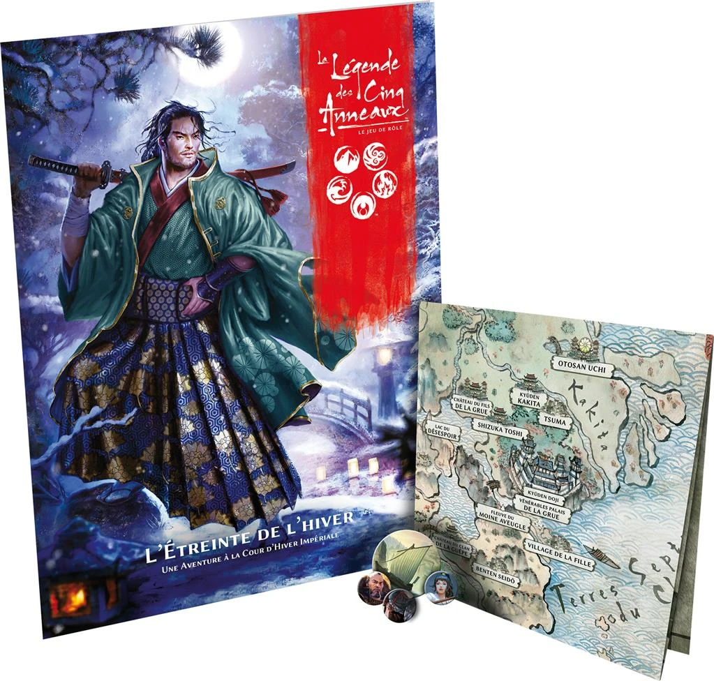L’Étreinte de l’hiver contient une aventure de 32 pages ; un plan recto verso plié représentant les terres des Clans de la Grue et de la Mante, ainsi que l’élégant Kyūden Doji, les Vénérables Palais de la Grue ; ainsi que plus de 50 jetons représentant les personnages de ce scénario.