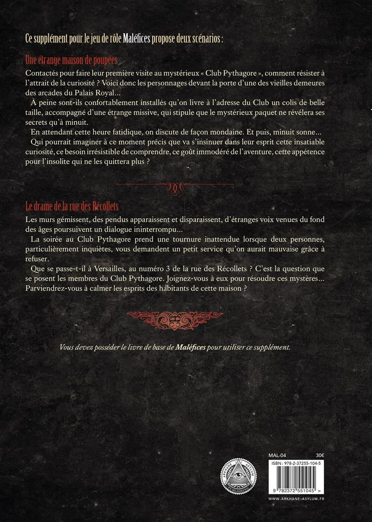 Les Enquêtes du Club Pythagore vous propose deux scénarios qui furent publiés il y a fort longtemps et qui ont en commun de concerner le fameux club Pythagore. Ces scénarios accompagnent parfaitement les deux du livre de base, formant ainsi un début de campagne, auquel peuvent être ajoutées les deux aventures inédites des Enquêtes Maléficieuses.