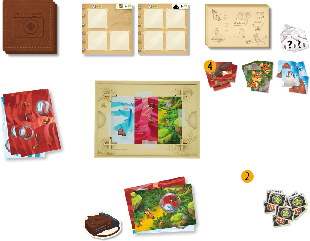 Si un animal apparaît partiellement ou entièrement dans les objectifs de votre carte Paysage, vous pouvez prendre la ou les tuiles Photo d’animaux correspondantes et les placer dans l’un de vos Albums photo en respectant les contraintes des Albums – uniquement des animaux de neige, par exemple.