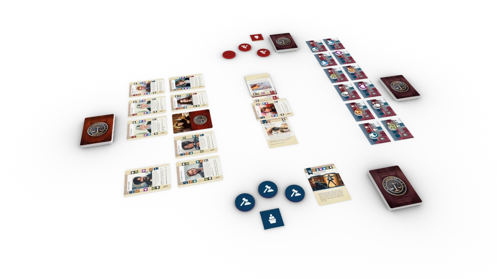 Vient ensuite la phase de ProcÚs, au cours de laquelle les joueurs appellent des témoins à la barre, élaborent des arguments puissants, les confrontent aux preuves patiemment examinées. Pour former un interrogatoire cohérent, les joueurs devront enchaßner leurs cartes en faisant correspondre des symboles de Préjugés.