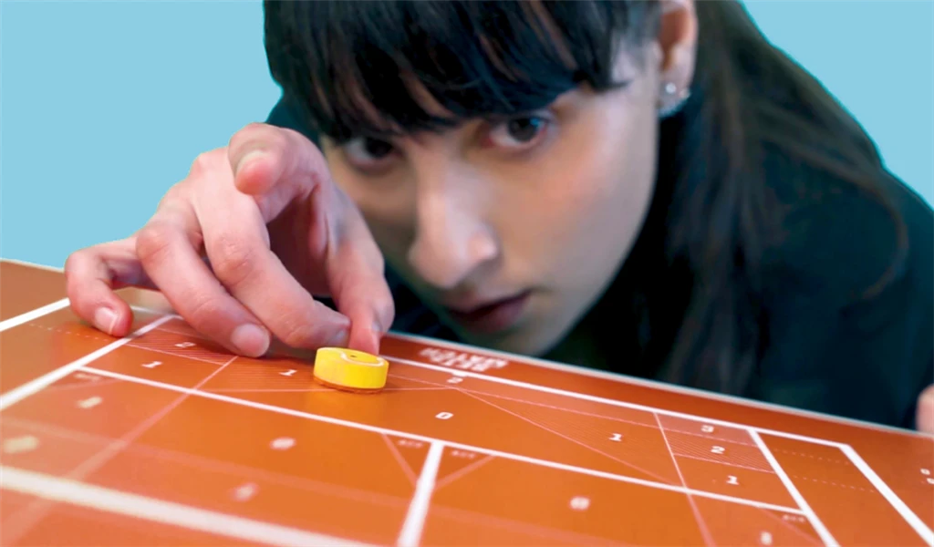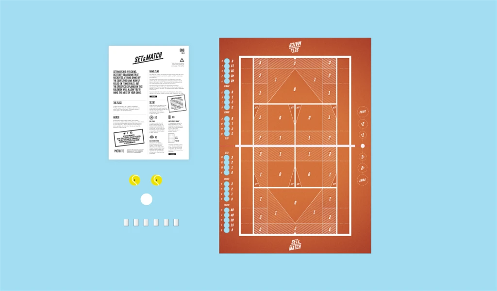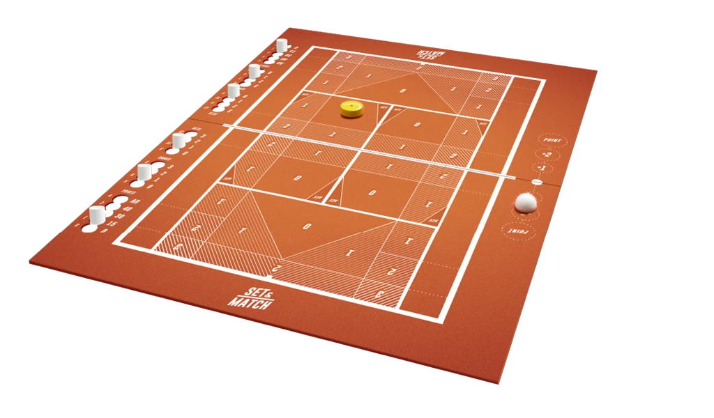 Set & Match se joue sur un plateau de jeu représentant un terrain de tennis où les joueurs, en simple ou en double, se renvoient la balle à coups de pichenettes.