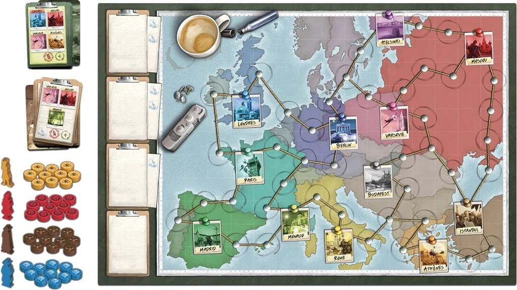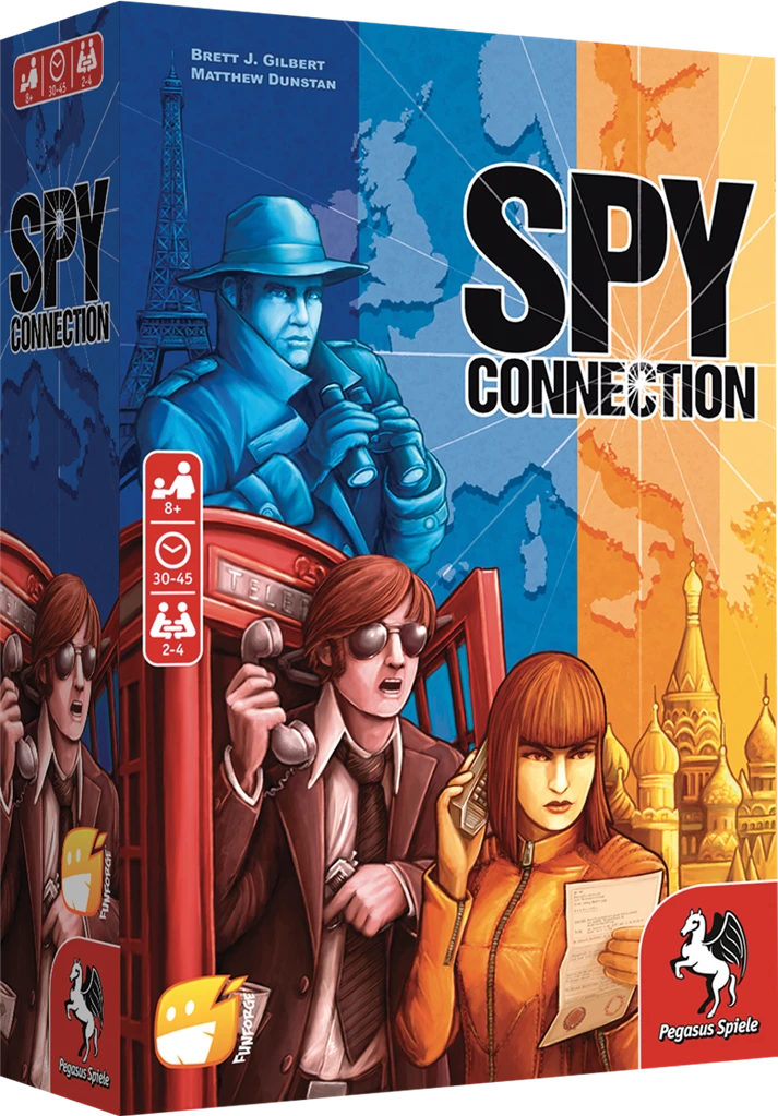 Dans Spy Connection, vous êtes des espions, chacun avec un réseau d’agents, et vous partez en mission dans 12 villes européennes. Déployez vos agents pour établir un réseau de connexions sécurisées entre les capitales européennes, ou envoyez-les au quartier général chercher de nouvelles missions. Mais prenez garde, les agents que vous affectez au QG ne seront pas disponibles pour vous aider à développer votre réseau À la fin de la partie, seul le plus efficace et le plus rusé d’entre vous pourra prétendre au titre de maître-espion.