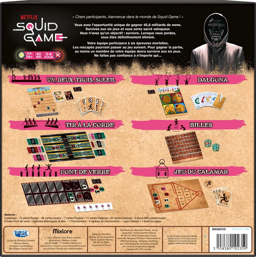 Les six épreuves se jouent dans l’ordre : Un, deux, trois, soleil ; Dalgona ; Tir à la corde, Billes, Pont de verre, et enfin le jeu du calamar (Squid, en anglais). Utilisant des cartes et des plateaux de jeu, Squid Game joue sur de nombreuses mécaniques, selon les épreuves : tactique, stop ou encore, anticipation, bluff , il y en a pour tous les goûts !